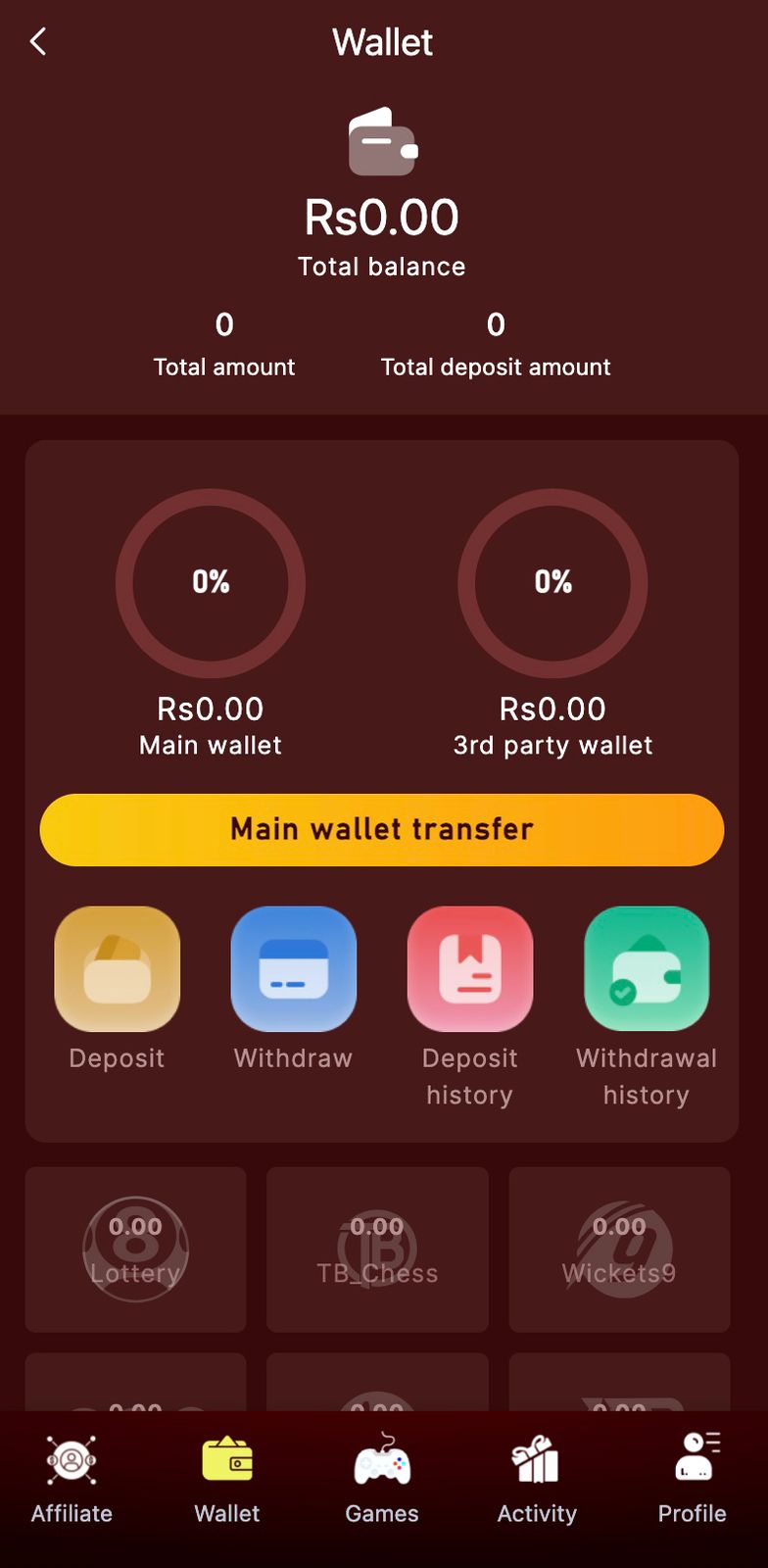 Users can track game history, deposits, and withdrawals